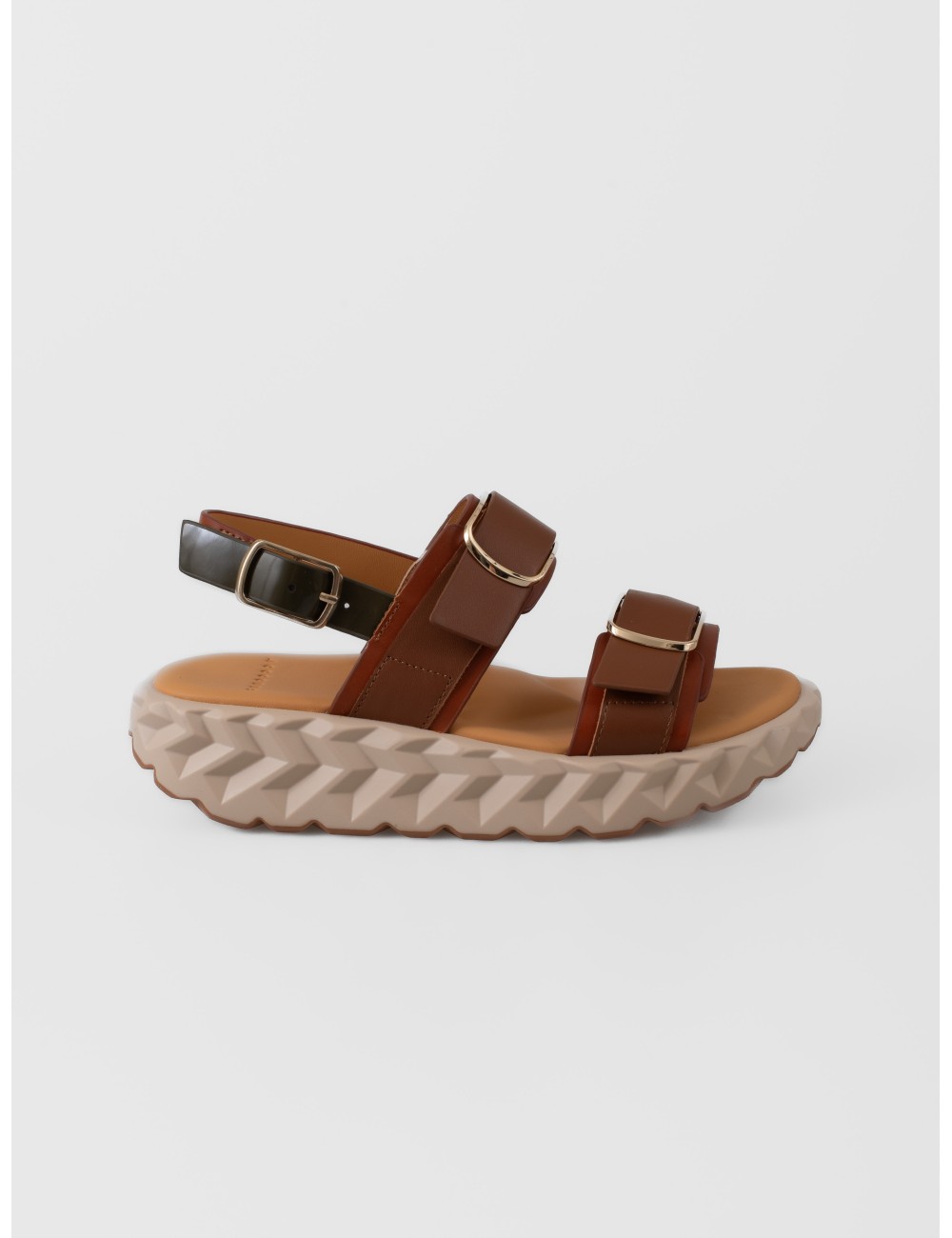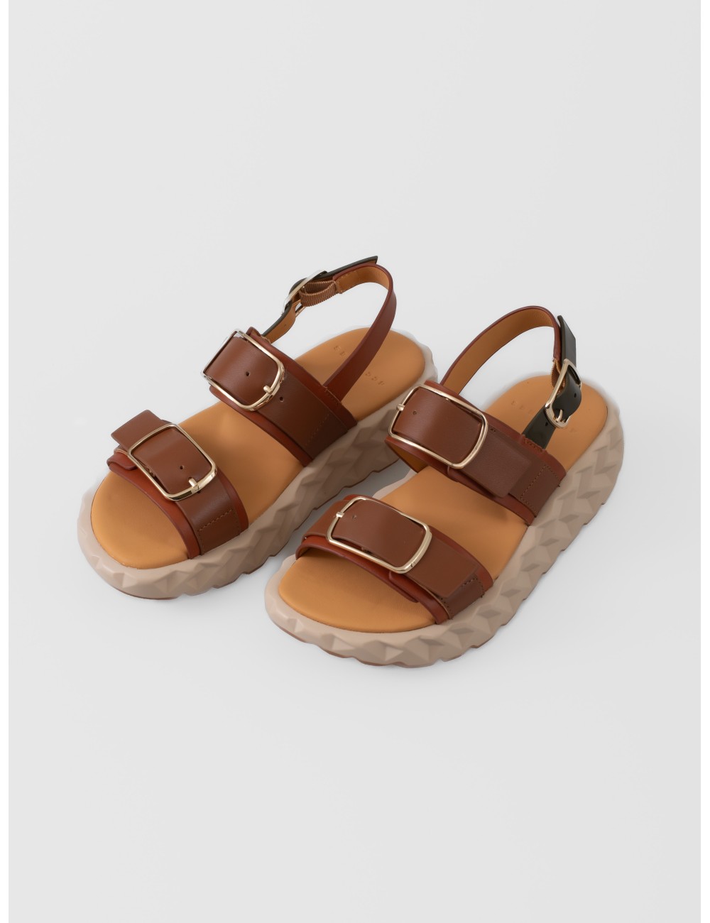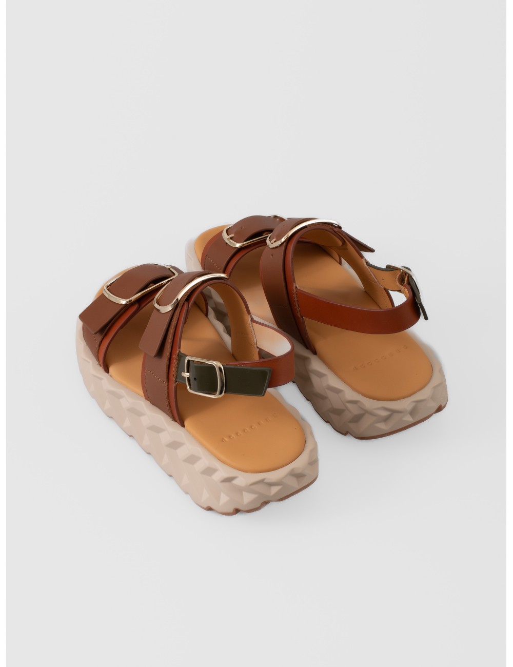 Sandalia de plataforma 4CCCCEES Jabara Sandy Brown en piel marrón con doble tira ajustable y suela dentada de gran volumen. Su diseño combina una construcción ligera con una base escultórica inspirada en pliegues, pensada para aportar estabilidad, flexibilidad y una presencia marcada en el uso diario.