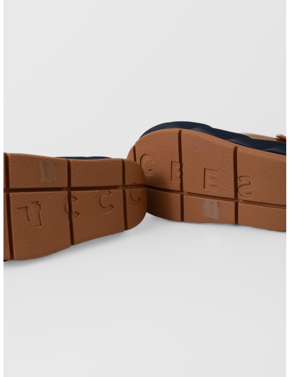 La piel dorada intensifica ese efecto sin volverlo estridente. En imagen, el acabado metalizado se equilibra con una pulsera trasera en tono neutro, una plantilla en cuero liso y una base bicolor con sección superior azul ondulada y fondo caramelo. Esa estructura de dos niveles forma parte del lenguaje de la línea Mellow: una capa superior más blanda para amortiguar y una base firme que aporta soporte y durabilidad en el uso diario.