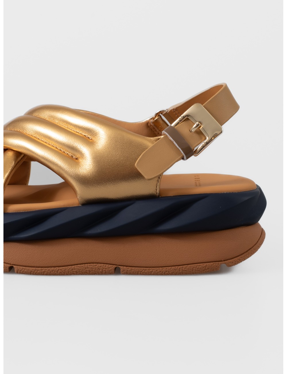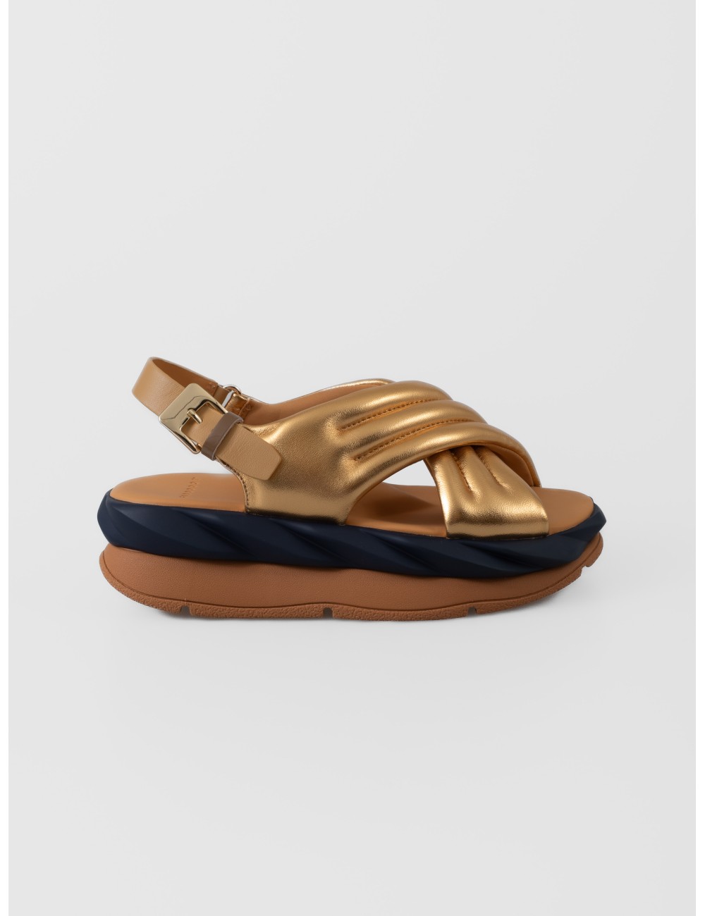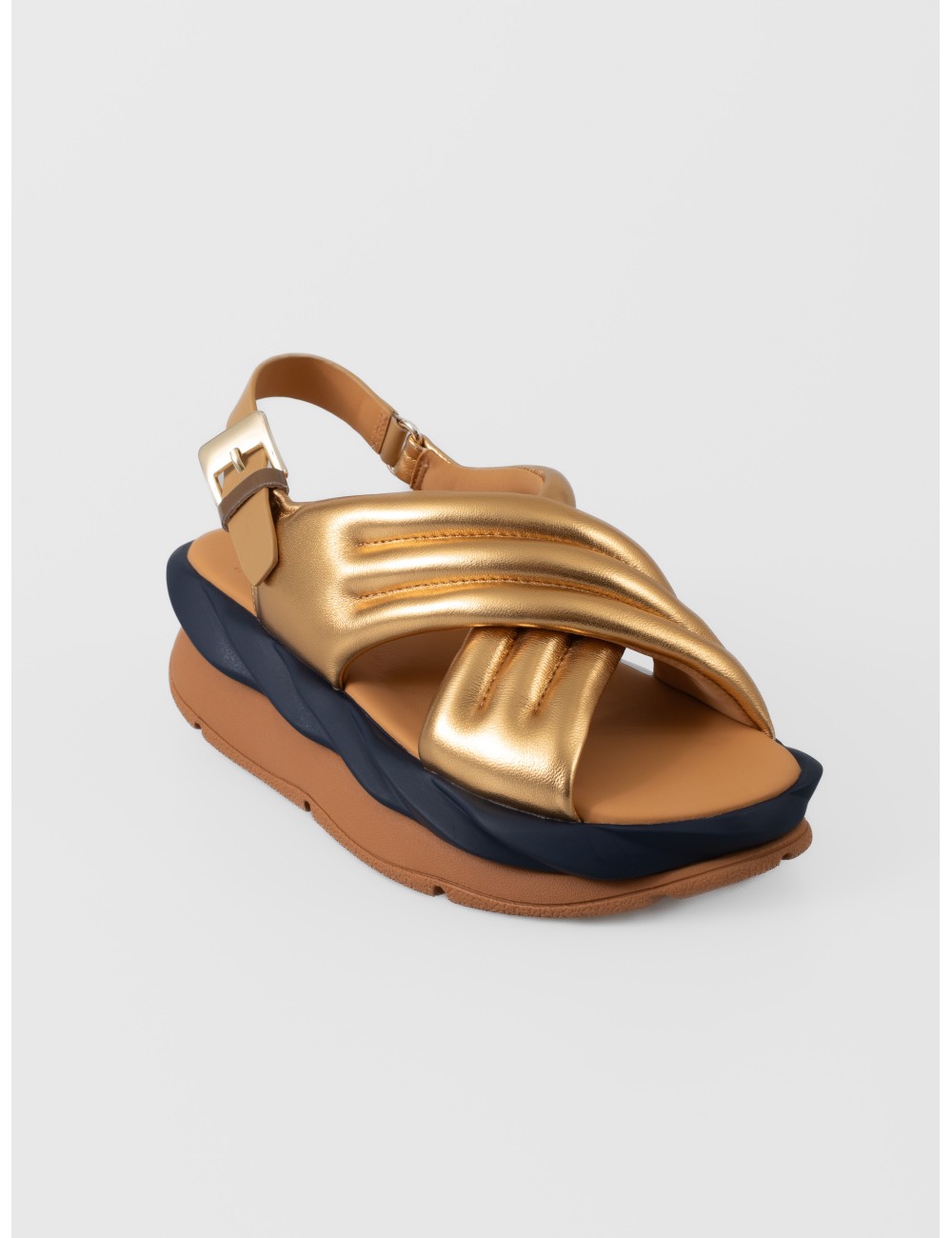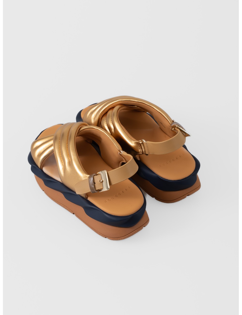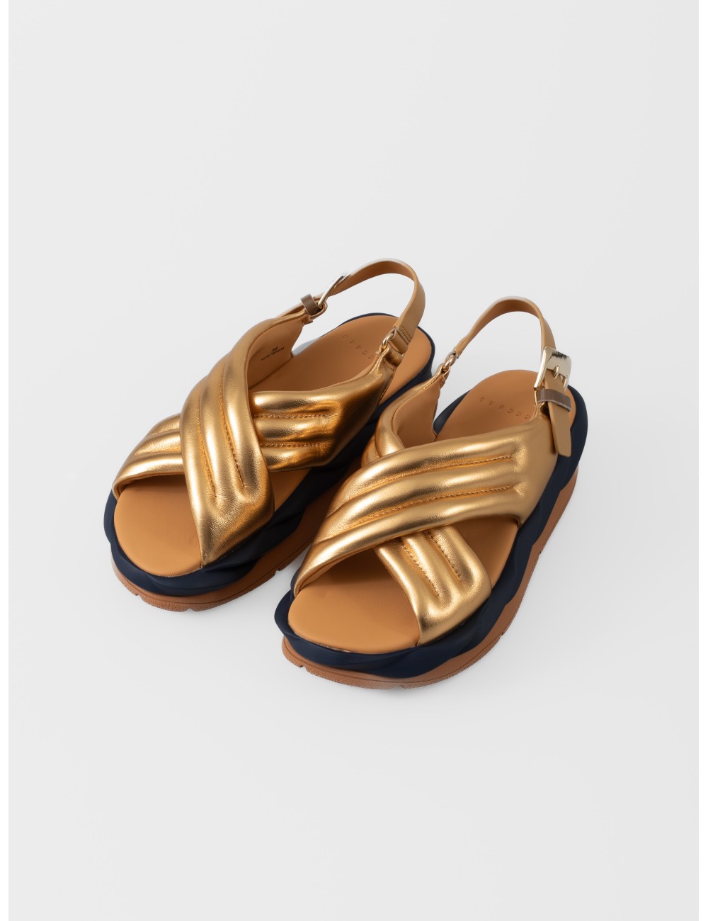 Sandalia de plataforma 4CCCCEES Mellow Mana Gold en piel dorada con tiras cruzadas acolchadas y pulsera trasera ajustable. Su silueta combina volumen suave, construcción ligera y una suela ondulada de dos niveles que aporta amortiguación, estabilidad y una presencia muy definida en clave contemporánea.