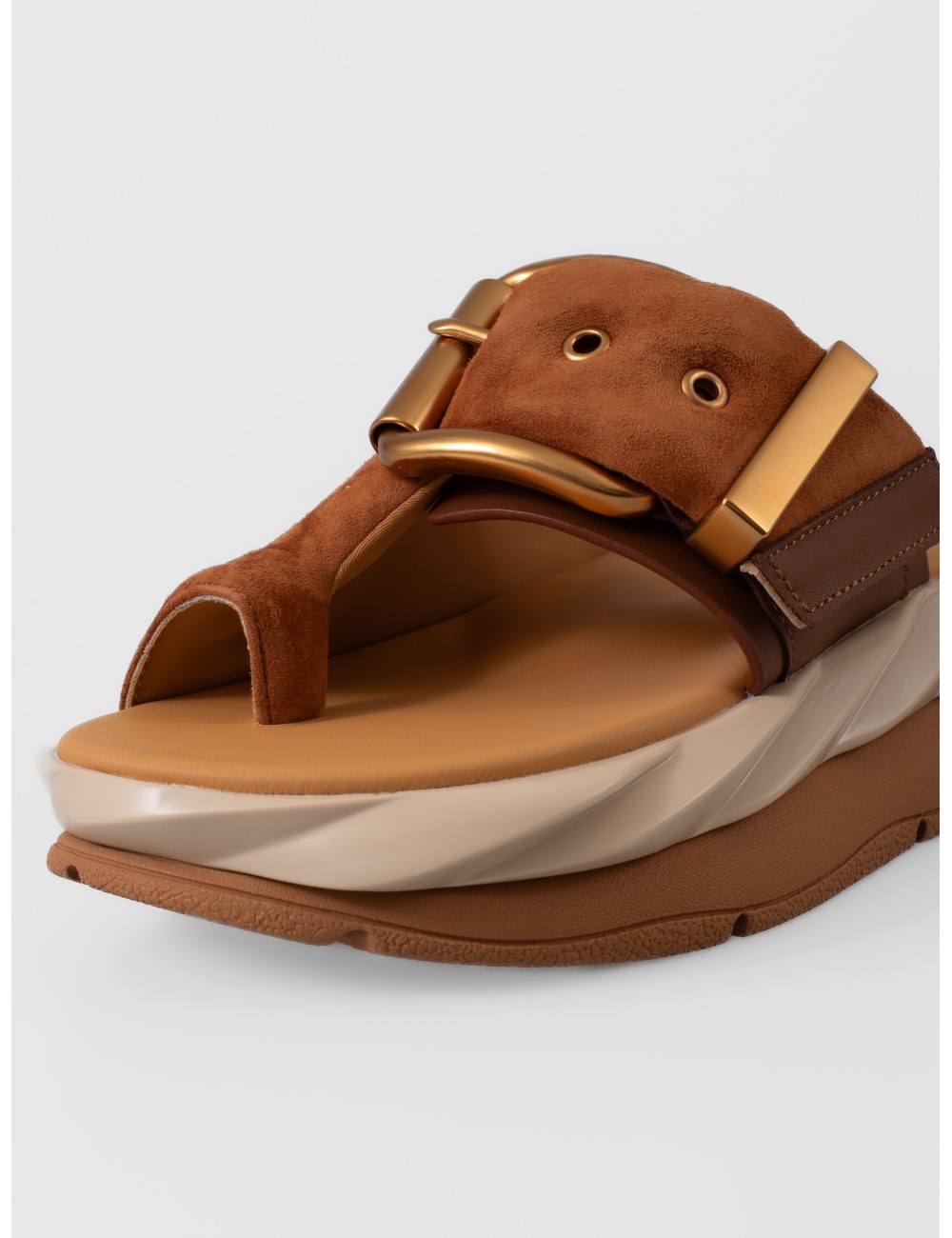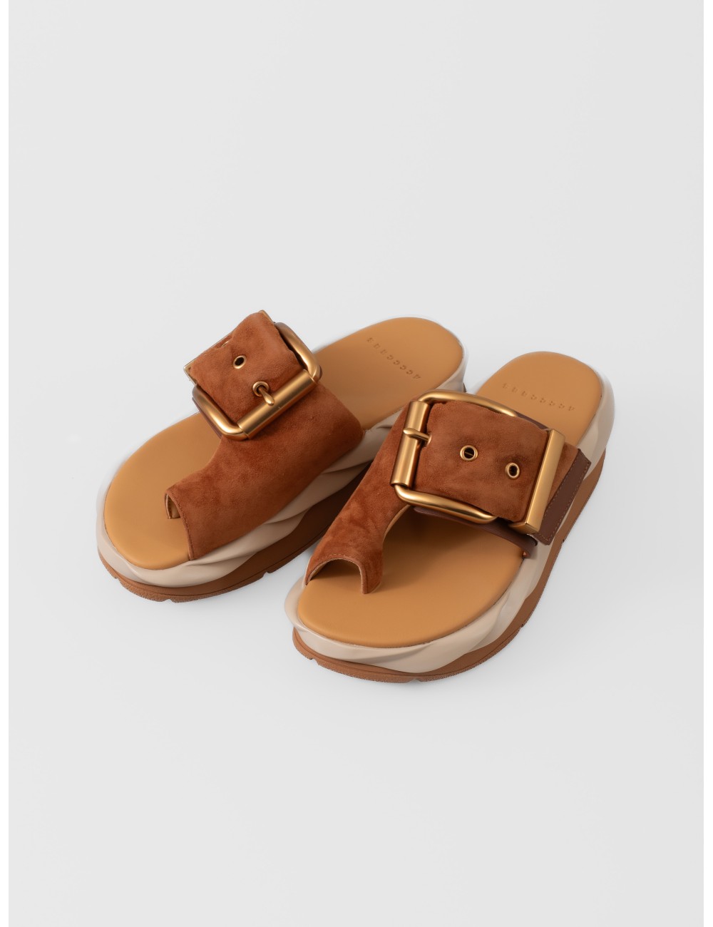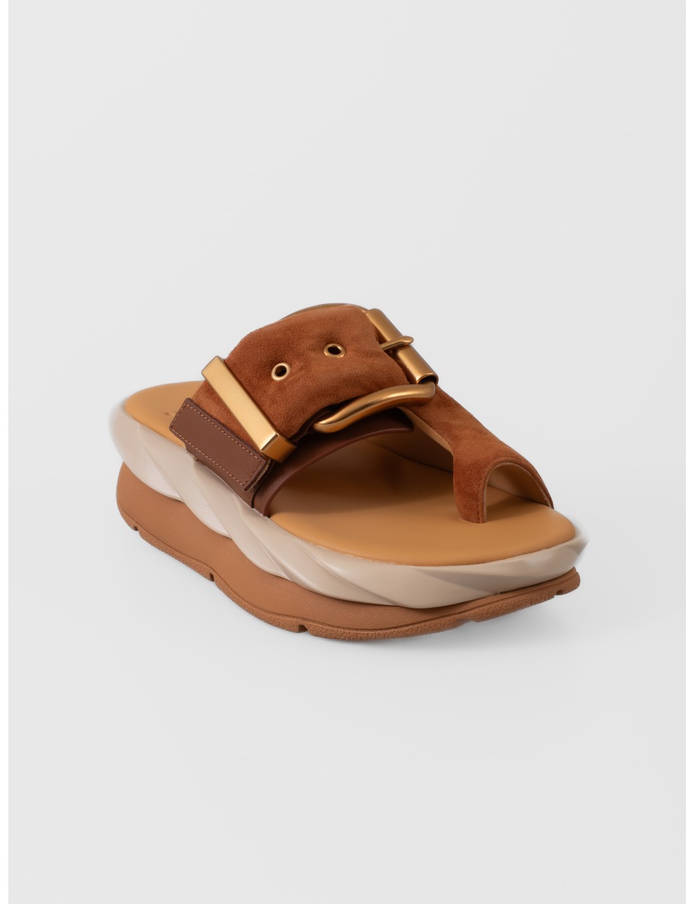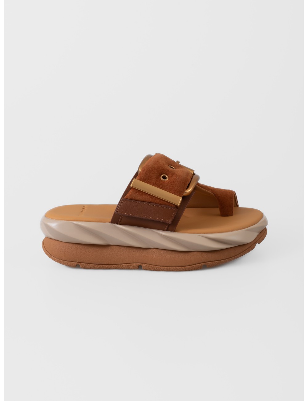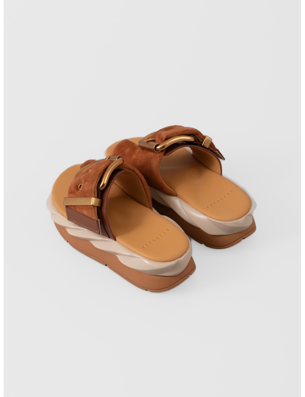 Detalles: Hebilla metálica oversize, altura de 55 mm, suela ondulada de dos niveles, acabado marrón soft.
