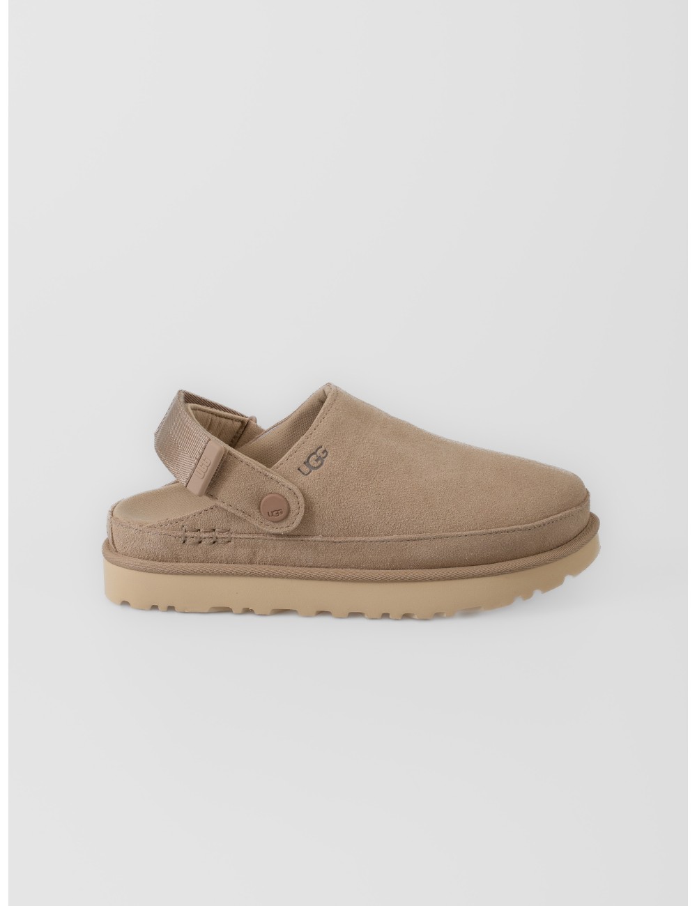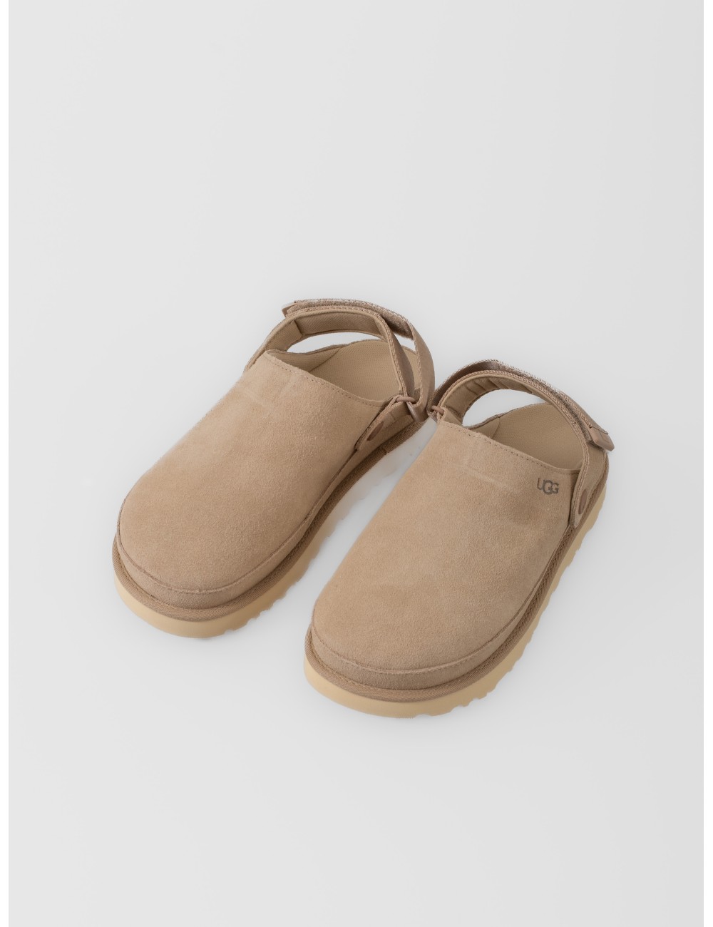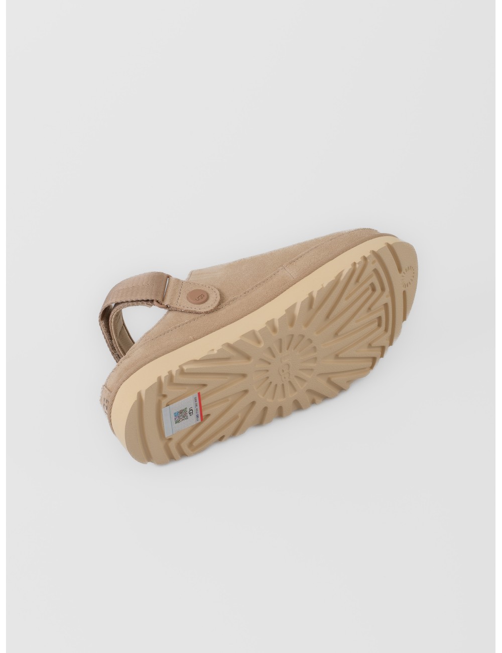 Zueco UGG Goldenstar Clog en color sand con pala cerrada, tira trasera regulable y suela ligera de perfil dentado. Confeccionado en ante, combina una silueta limpia y envolvente con una construcción versátil que permite llevar la tira al talón o abatida. La base de EVA de caña de azúcar refuerza la ligereza y favorece un uso cómodo en el día a día.