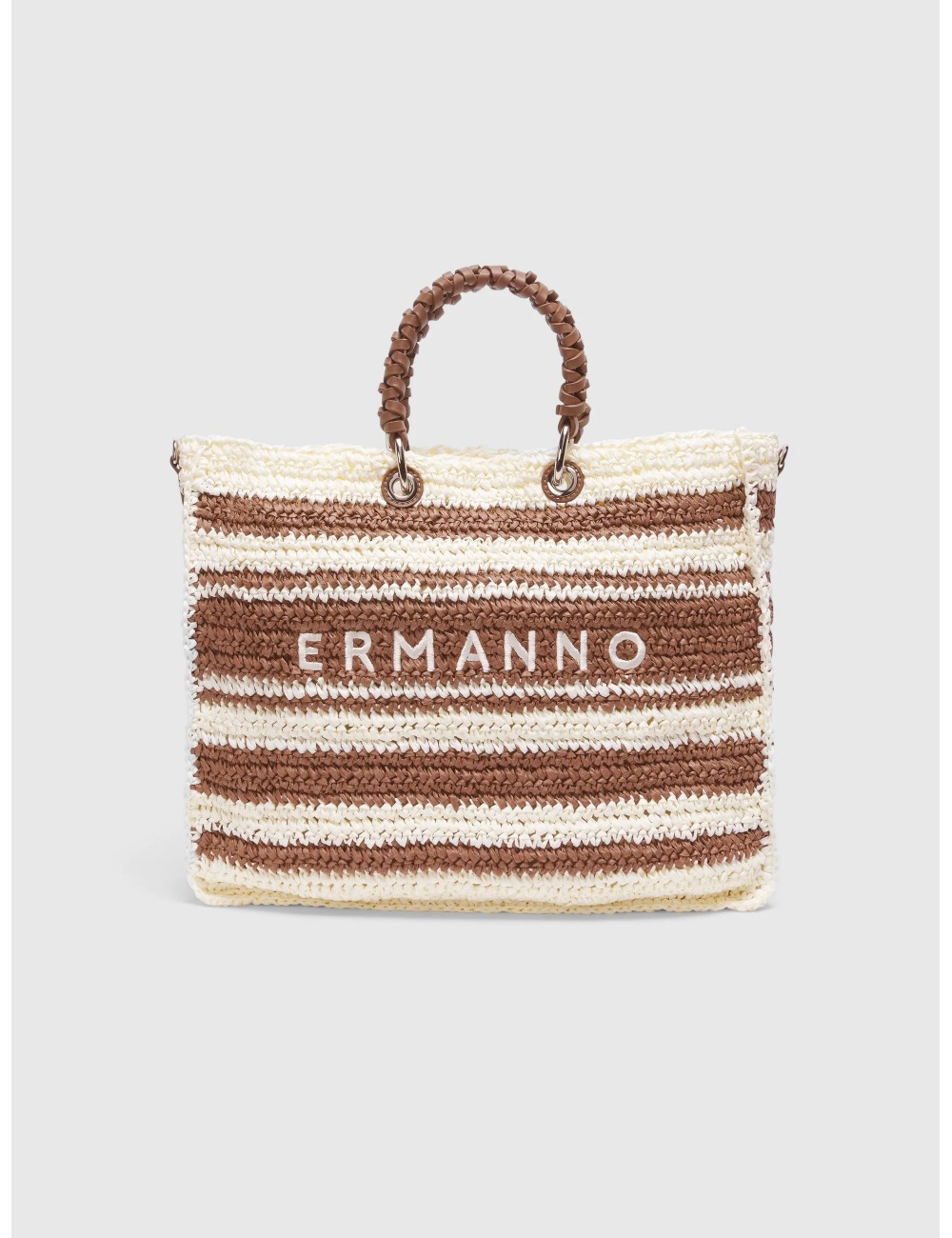 Bolso shopping grande Ermanno Firenze de efecto rafia a rayas para mujer en color crema. Presenta construcción crochet bicolor, asas superiores trenzadas, logo ERMANNO bordado en el frontal y una silueta estructurada de inspiración estival. El diseño combina ligereza visual y capacidad cotidiana con una lectura limpia y gráfica.