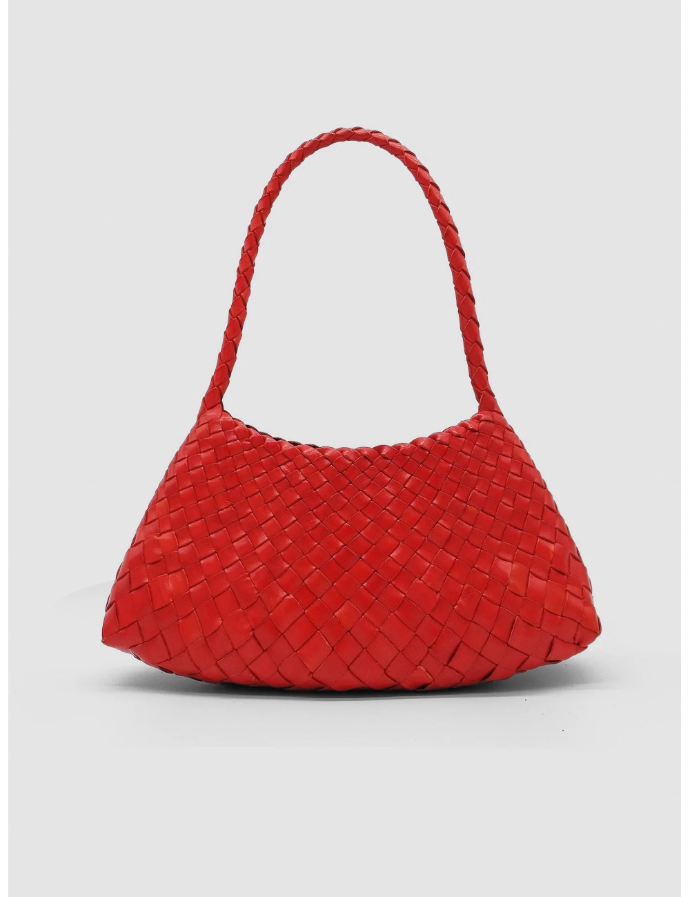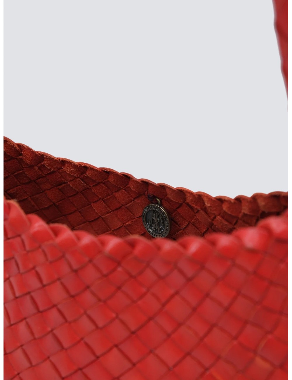 En color Poppy Red, el bolso adquiere una expresión más vibrante sin perder la sobriedad de su construcción. La forma alargada, con extremos suavemente triangulares, introduce una línea distinta dentro del repertorio trenzado de la firma. El asa única integrada mantiene la continuidad visual del diseño y permite llevarlo al hombro con naturalidad, mientras que la abertura superior abierta refuerza su uso directo y cotidiano. En el interior, la medalla St. Christopher cosida a mano aporta un detalle distintivo ligado al universo artesanal de Dragon Diffusion.