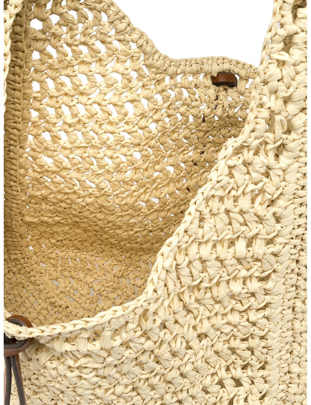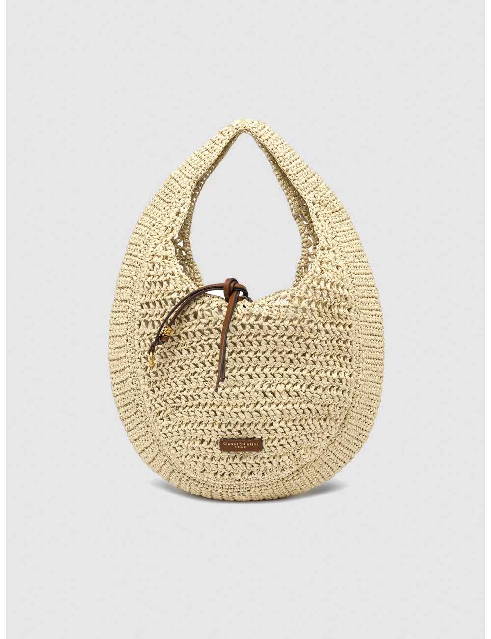 Bolso Gianni Chiarini Firenze Neffeli en color corda con diseño hobo de rafia trenzada. Confeccionado en fibra natural, presenta una silueta redondeada con asa integrada y cierre mediante cordón ajustable. Ligero y flexible, está pensado para un uso estacional con un enfoque relajado.