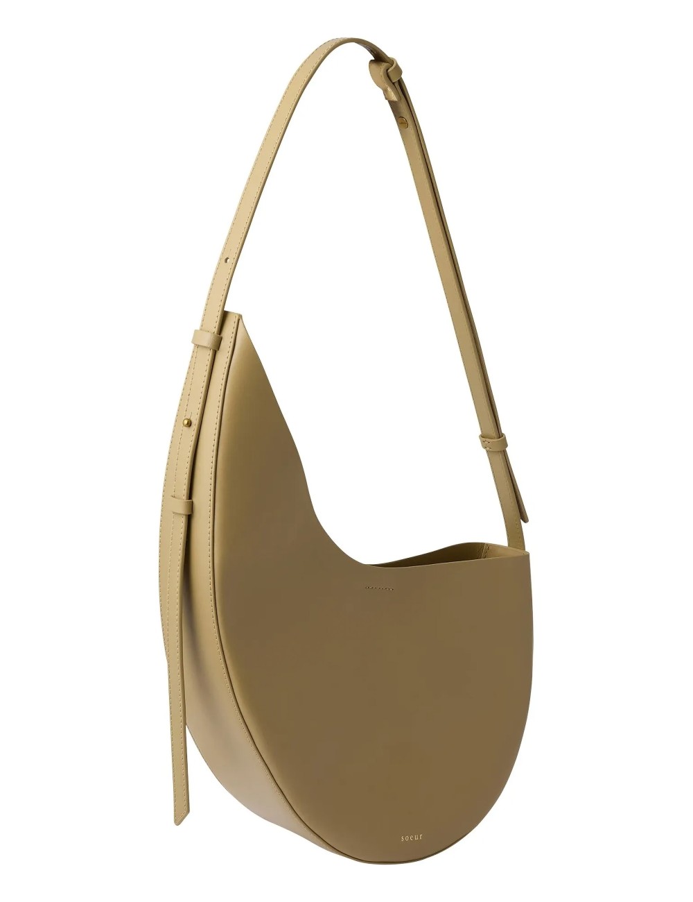 Winona resume bien la inclinación de Soeur por las líneas limpias y las proporciones contenidas. La forma asimétrica, amplia en la base y elevada en uno de sus lados, crea una silueta muy reconocible que se acomoda de forma natural bajo el brazo. El acabado en piel lisa refuerza esa lectura depurada y deja que el volumen sea el elemento principal, sin costuras visibles ni recursos decorativos que desvíen la atención.