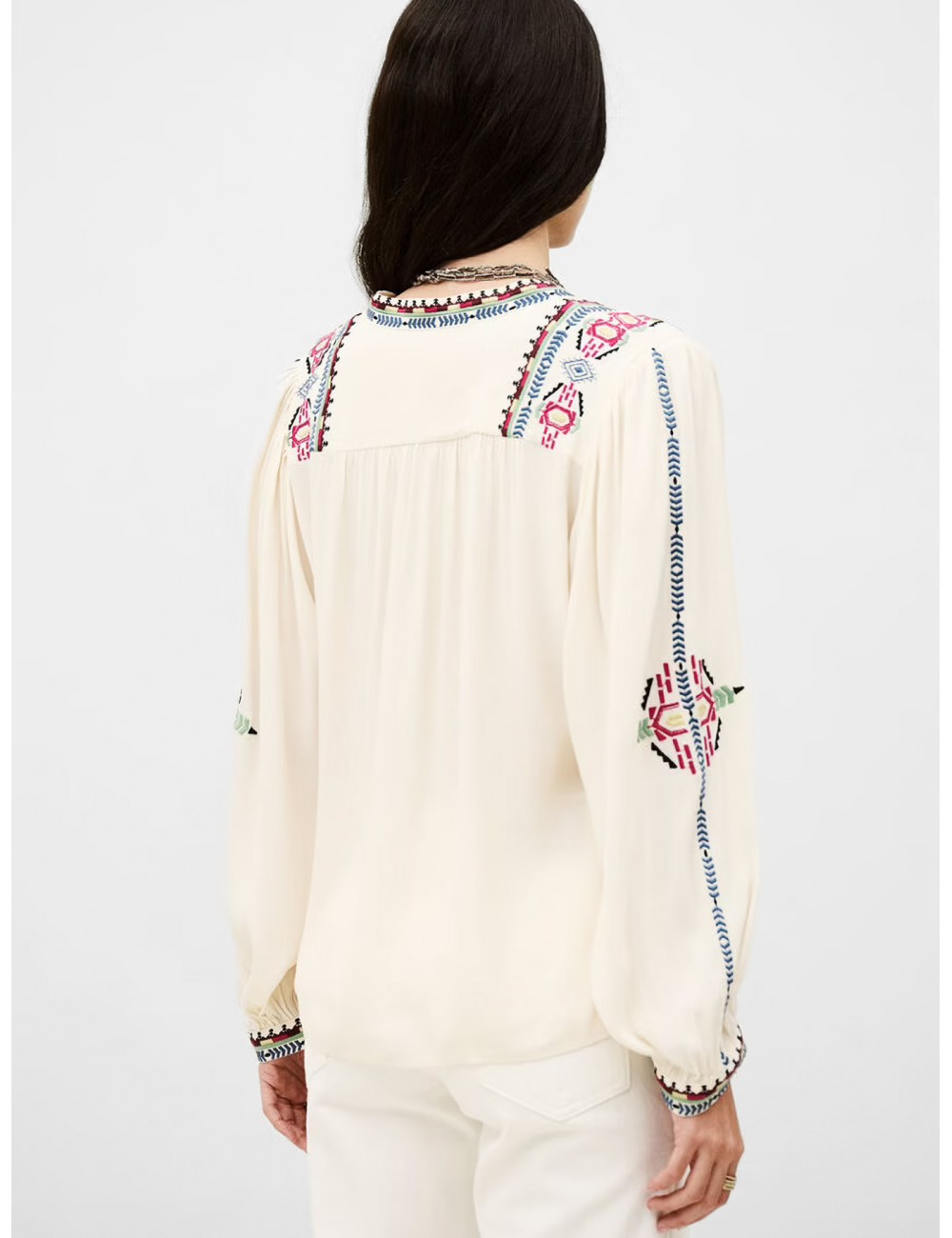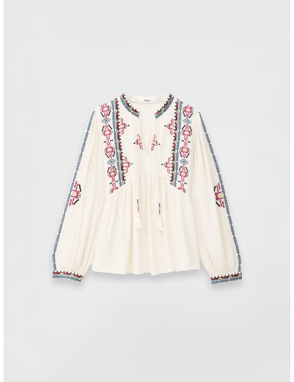 Blusa ba&sh Blouse Tilt Ecru para mujer con bordados decorativos en contraste y silueta fluida. Presenta cuello redondo abierto con lazadas, manga larga con volumen suave y acabado fruncido. Su construcción ligera y su trabajo ornamental en delantero, mangas y contorno del cuello aportan una presencia delicada y expresiva, fácil de integrar en estilismos relajados o más cuidados.