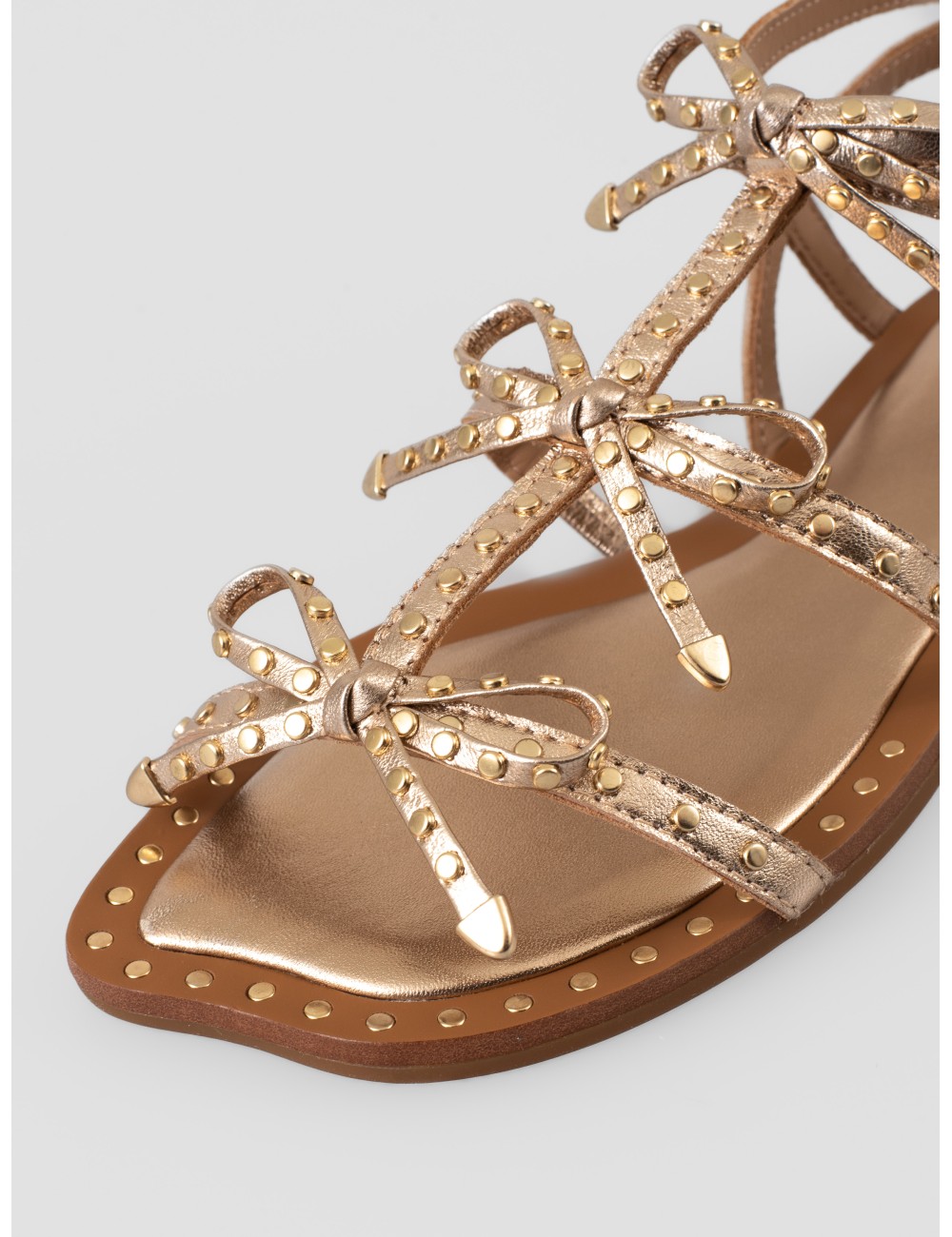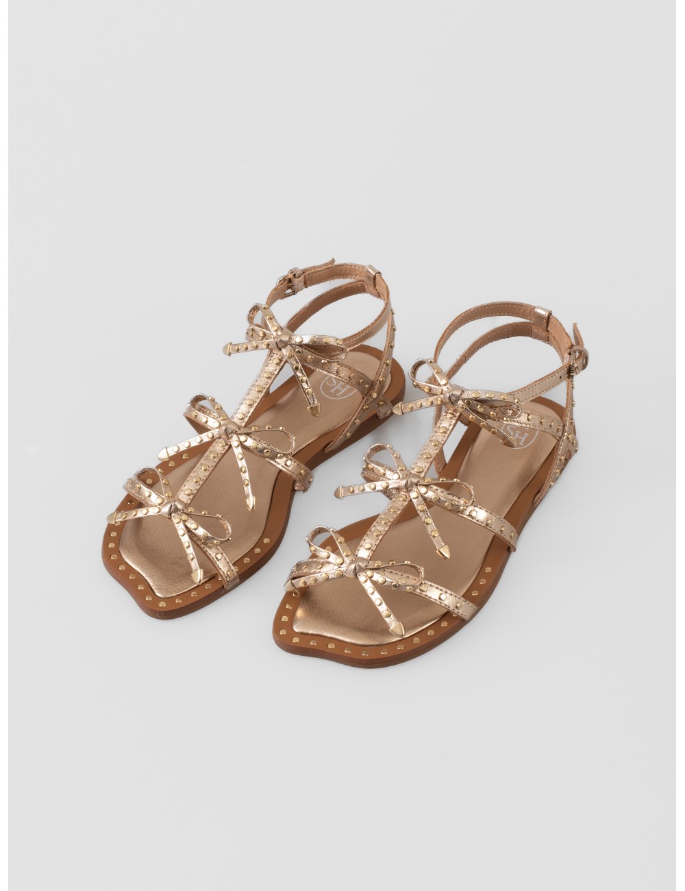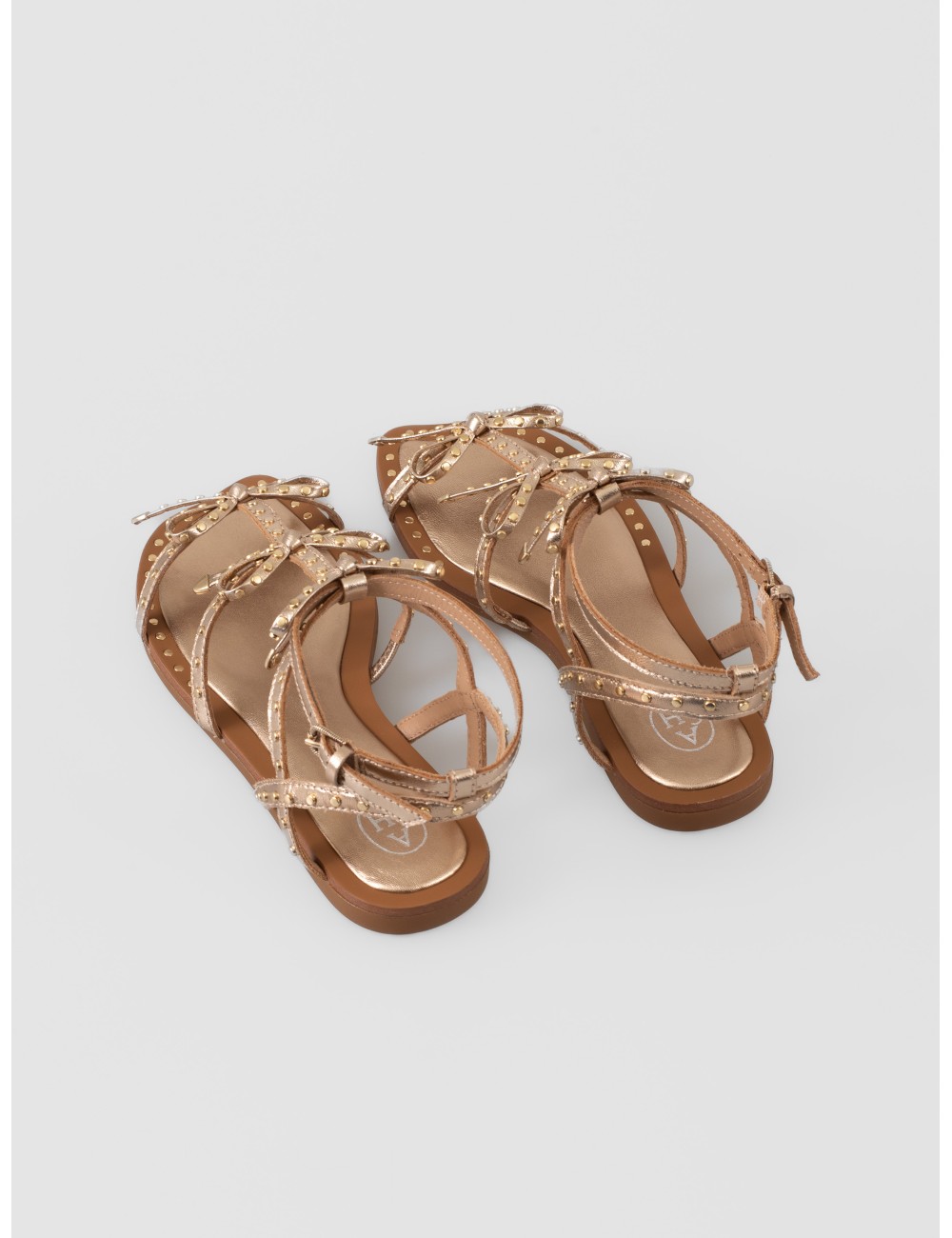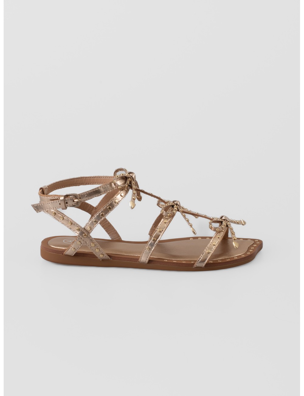 Detalles: sandalia plana, tiras finas, cierre con hebilla al tobillo, lazos decorativos en el empeine, aplicaciones metálicas, plantilla abierta, puntera redondeada, suela baja.