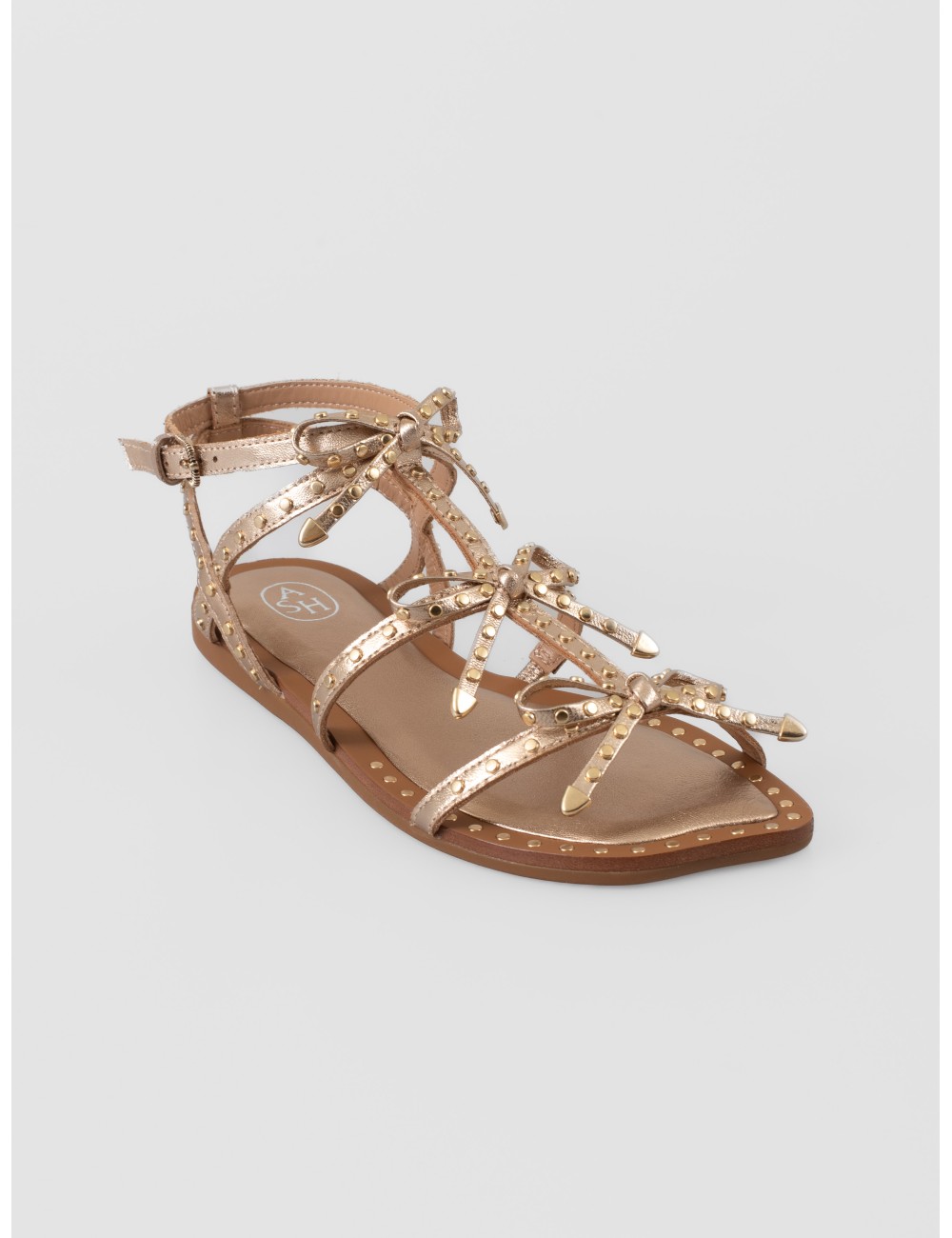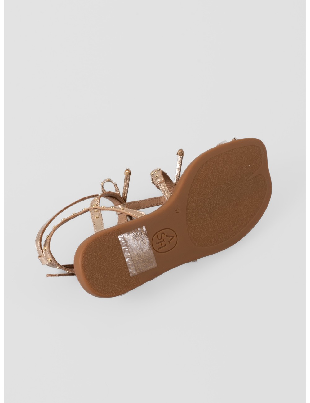 Sandalia plana ASH Gladius en color Mekong con tiras finas metalizadas y diseño de inspiración joya. La silueta abierta recorre el empeine con un trazado delicado, rematado por pequeñas aplicaciones metálicas y lazos decorativos. La base baja y el acabado luminoso refuerzan un perfil ligero, ornamental y pensado para el verano.