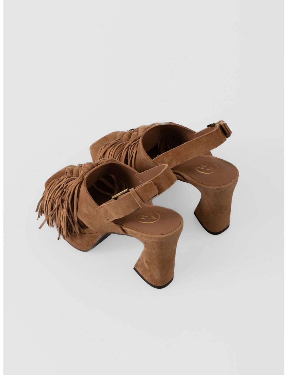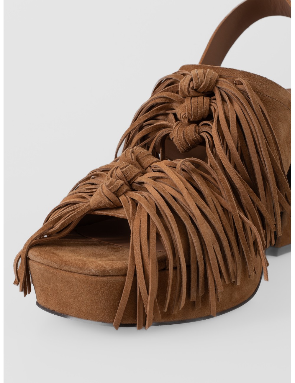 Su rasgo más distintivo está en las tiras frontales con flecos, que aportan movimiento y una presencia muy marcada. La plataforma y el tacón ancho refuerzan además su silueta contundente.