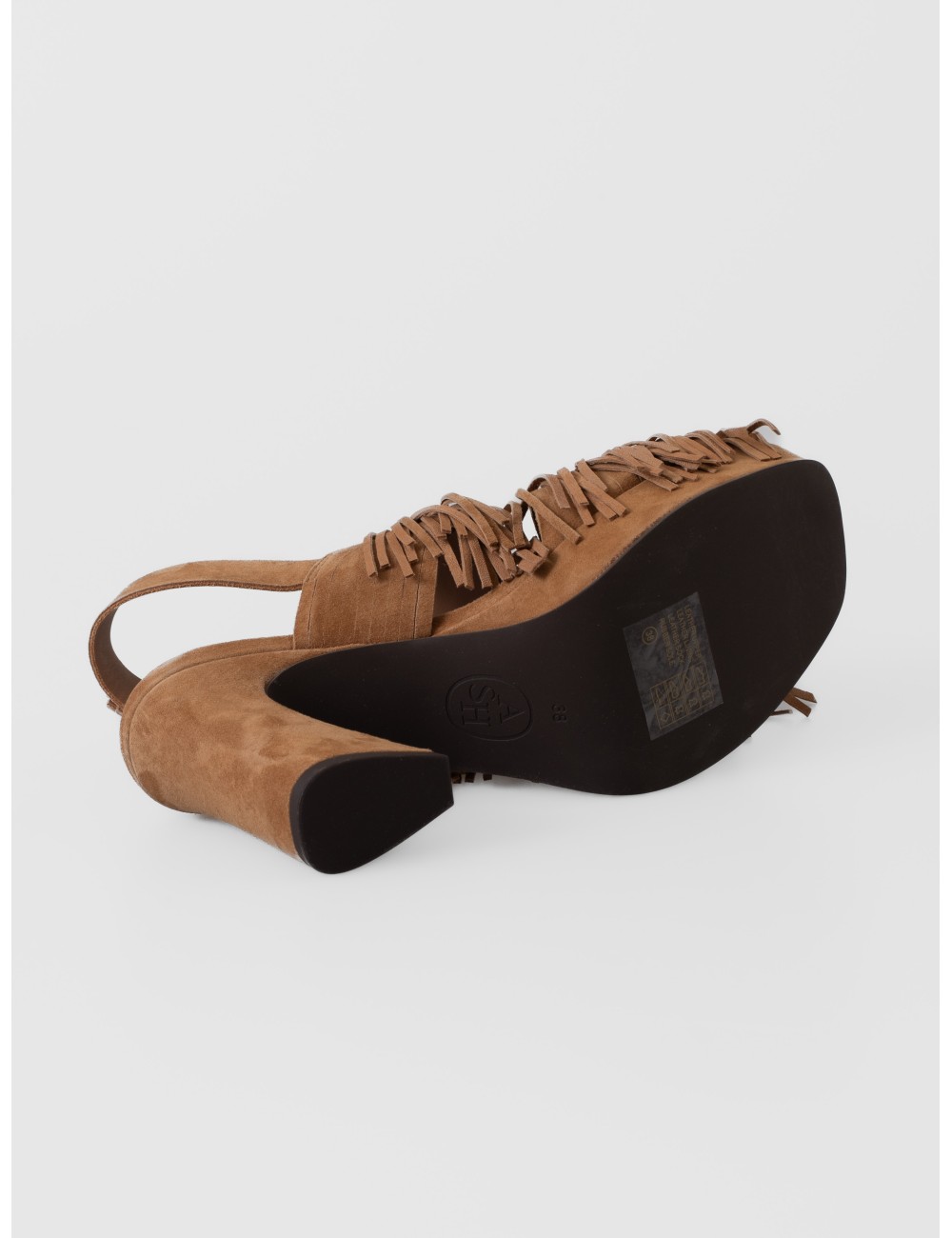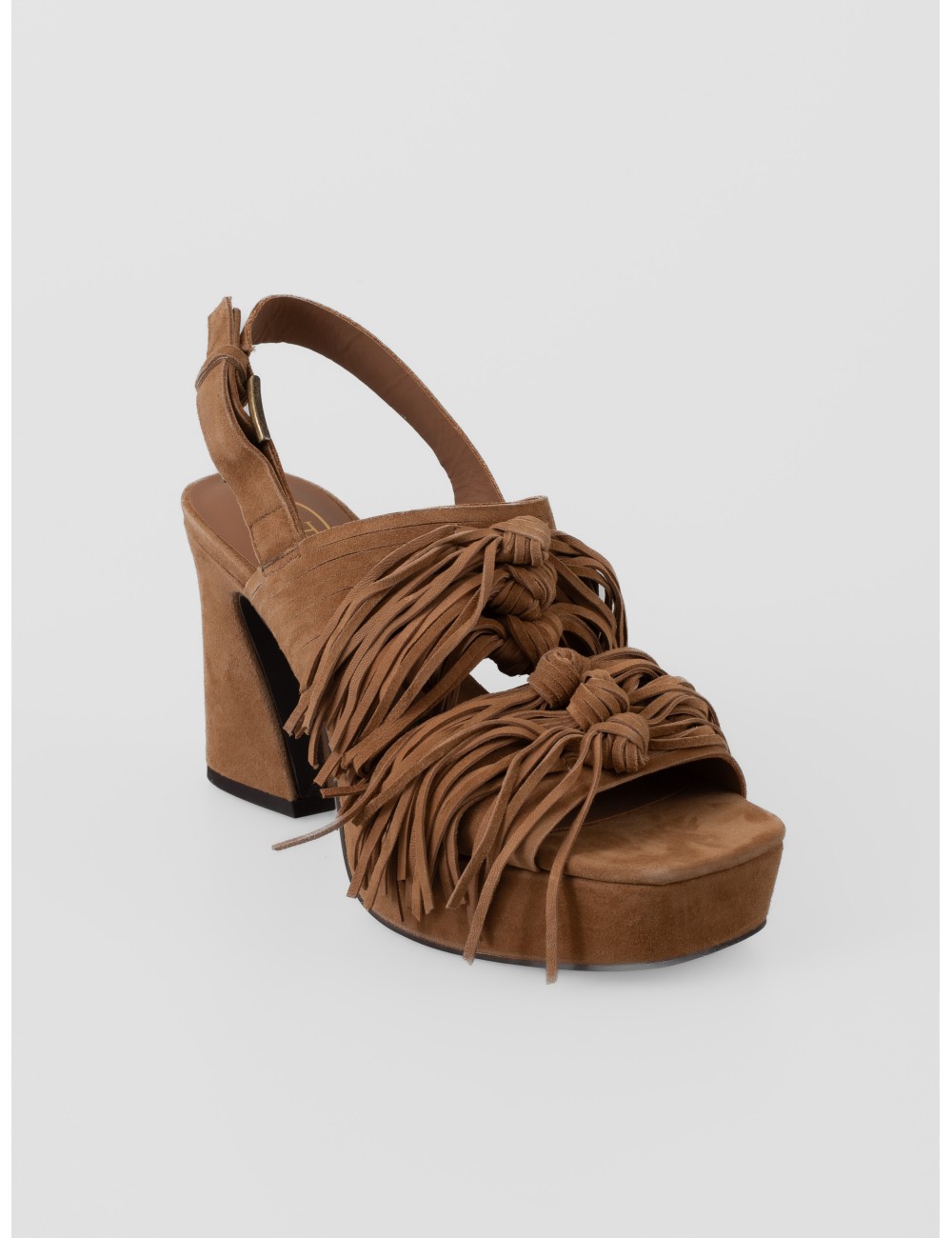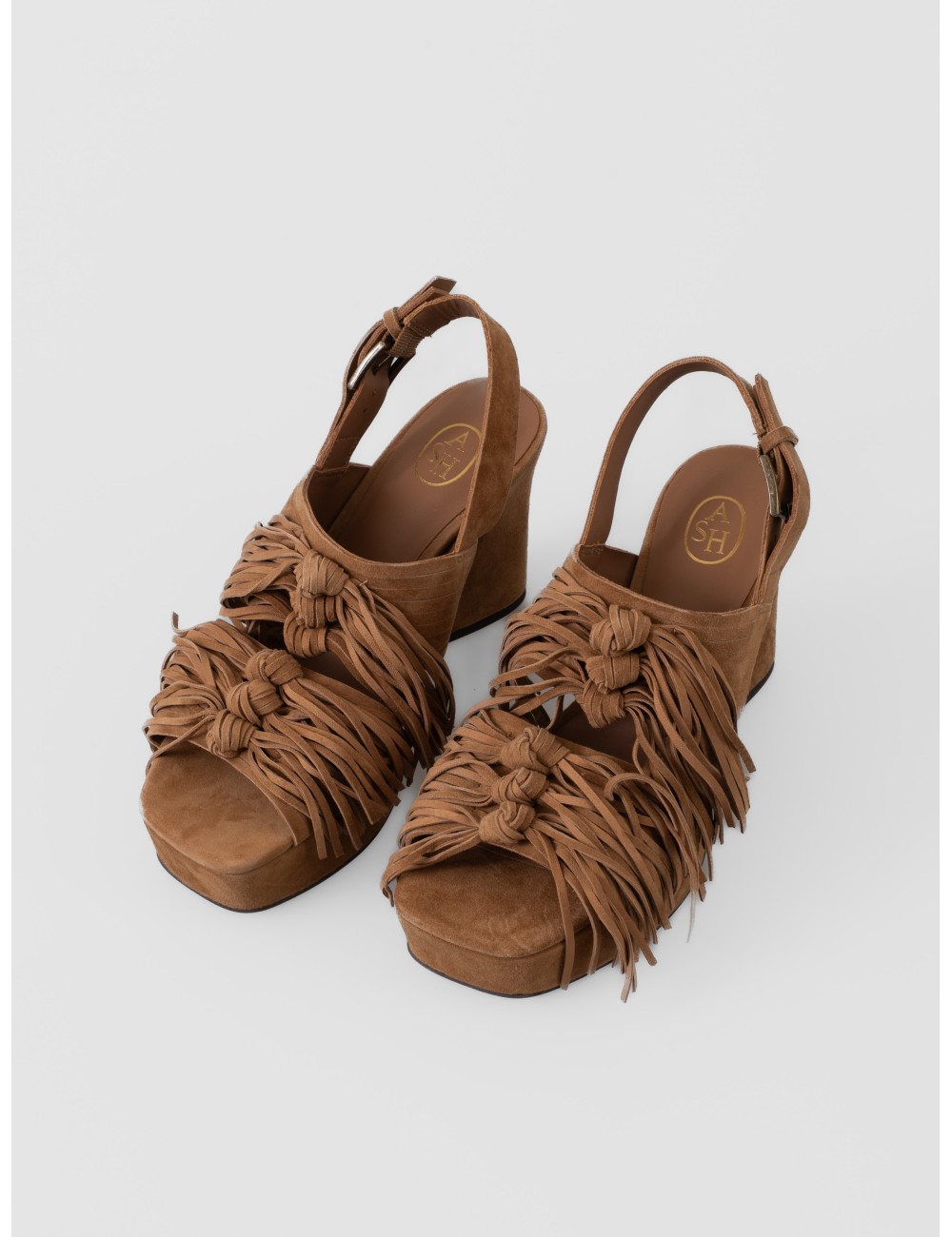 Sandalia de tacón Ash Oprah en color moka mou. Con plataforma delantera, pulsera al tobillo y dos tiras frontales con flecos, combina volumen y movimiento en una silueta abierta de marcada presencia. El acabado uniforme y el tacón ancho equilibran el conjunto y refuerzan su carácter expresivo dentro de un uso sofisticado y versátil.