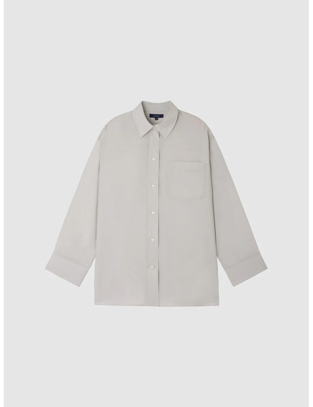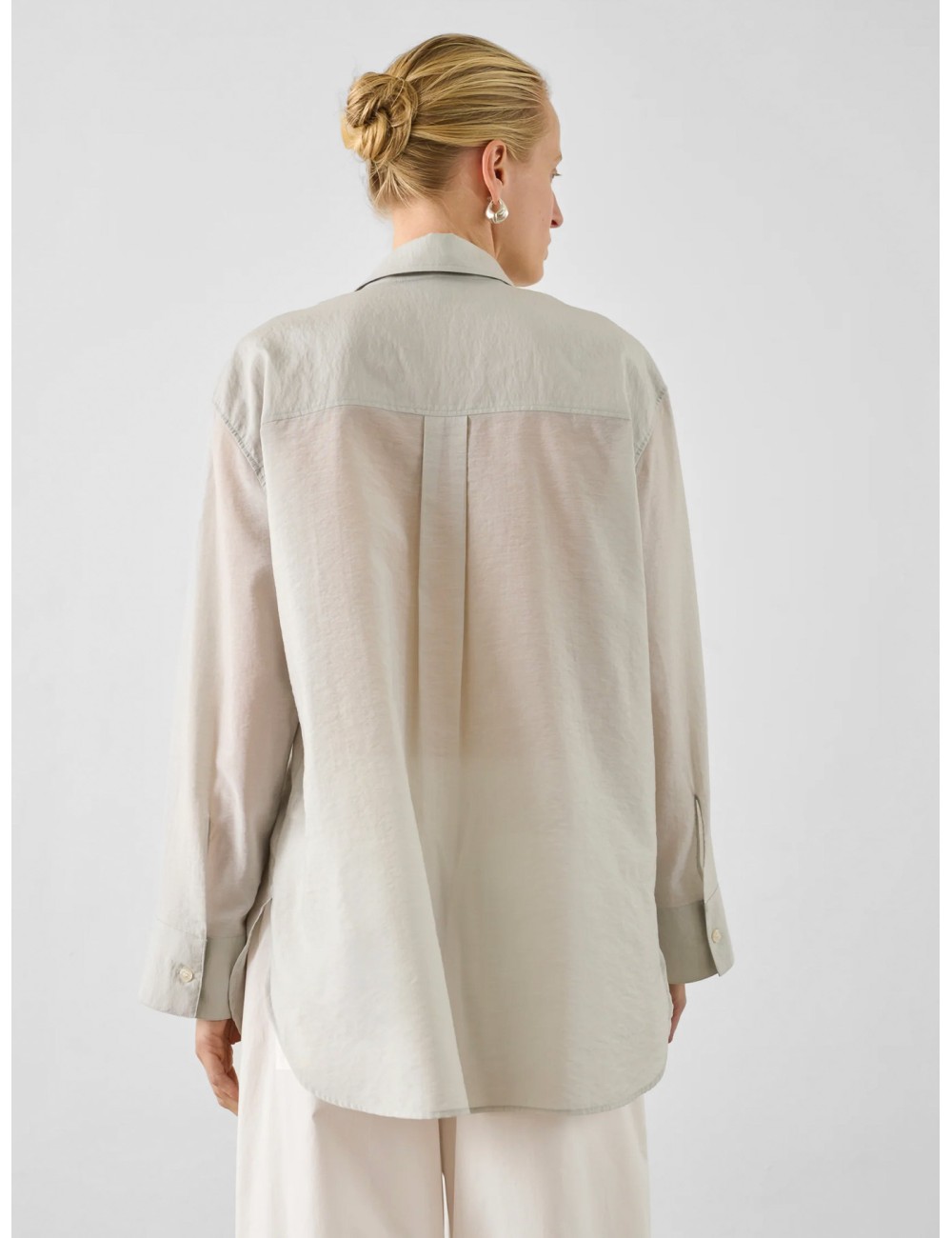 El color gris clair subraya esa lectura depurada. Su tono suave y neutro aporta luminosidad sin rigidez y permite integrarla con facilidad en combinaciones muy distintas, desde pantalones amplios y sastrería relajada hasta denim, faldas limpias o capas ligeras. El bolsillo de parche en el pecho introduce un detalle funcional discreto, mientras el cuello clásico y la botonadura frontal mantienen el conjunto dentro de un registro atemporal.