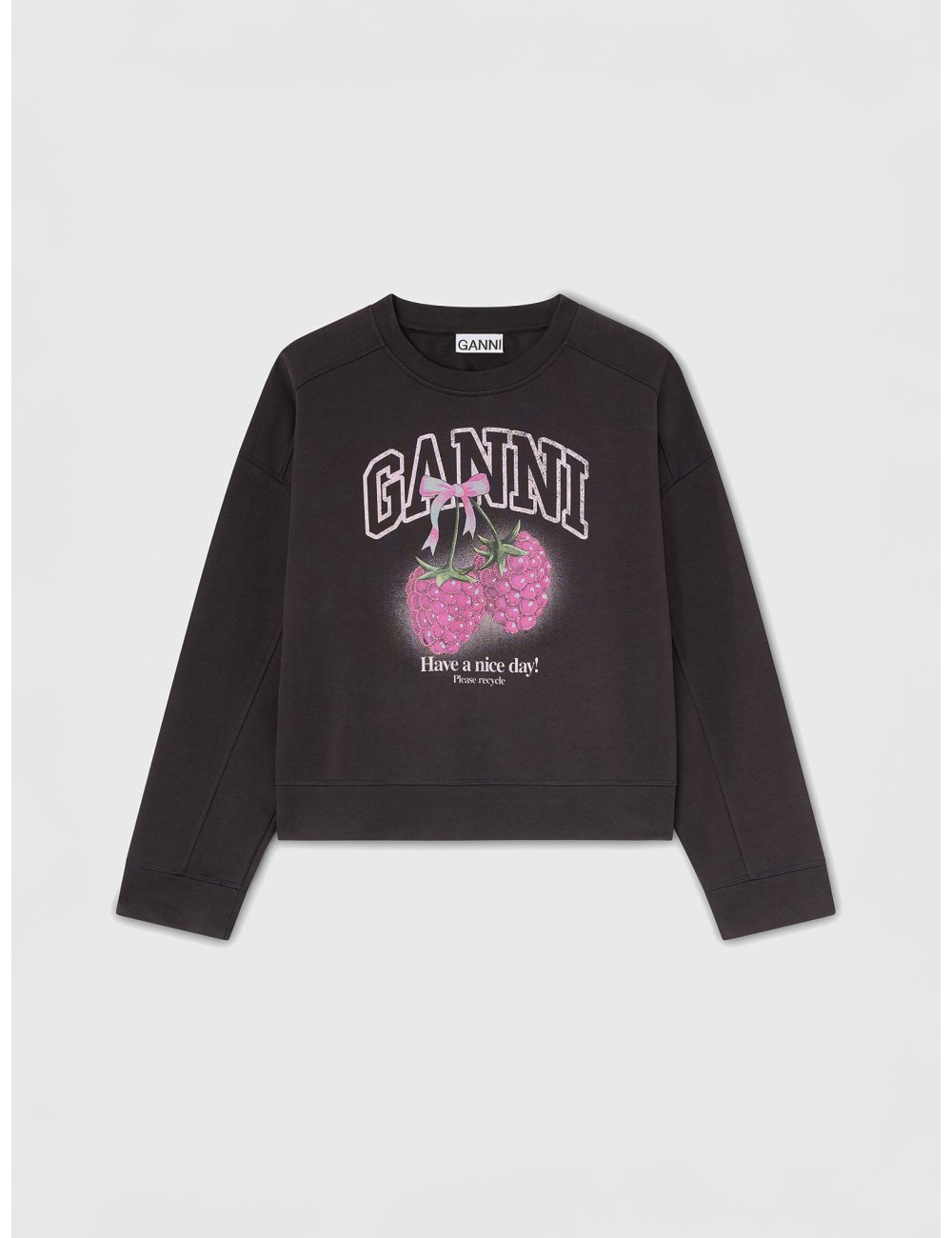 La sudadera Ganni Crewneck with Raspberries en color phantom combina una base oscura con una gráfica frontal de gran presencia. El logotipo arqueado, el motivo de frambuesas y el mensaje “Have a nice day! Please recycle” definen una pieza de carácter visual marcado, equilibrada por una silueta limpia y una construcción clásica de cuello redondo.