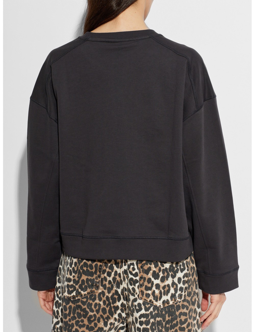 La Crewneck with Raspberries de Ganni parte de una construcción esencial para dar protagonismo al trabajo gráfico frontal. Sobre la base phantom, un tono muy oscuro de lectura sobria, el logotipo en arco y las frambuesas en rosa generan un contraste inmediato que concentra la identidad visual de la prenda. El resultado se mueve entre una referencia college y un tratamiento más lúdico, muy reconocible dentro del lenguaje de la marca.