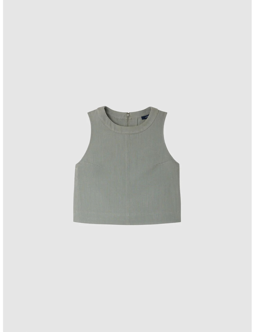 El color vert d'eau aporta un matiz especialmente suave al diseño. Su tono, entre verde agua y gris verdoso, rebaja la rigidez que podría tener una pieza de líneas tan definidas y le da una lectura más luminosa y tranquila. La costura central delantera y las líneas de construcción del pecho introducen estructura visual sin romper la sobriedad del conjunto, mientras el cuello redondo amplio refuerza la limpieza general del top.