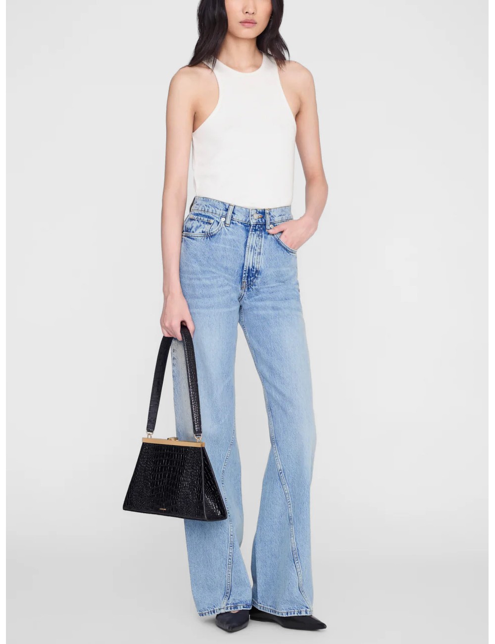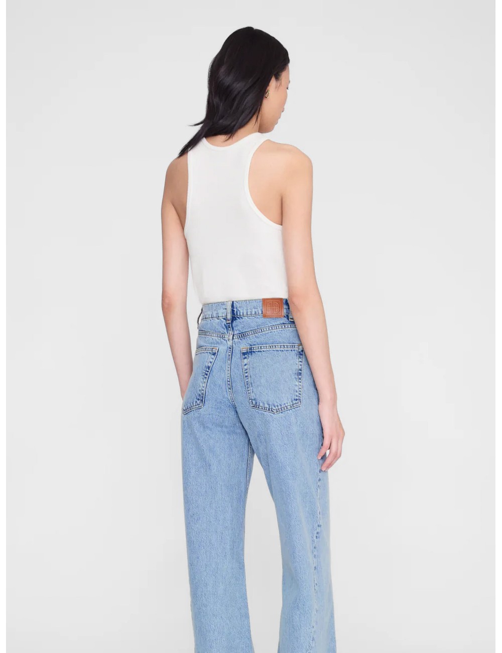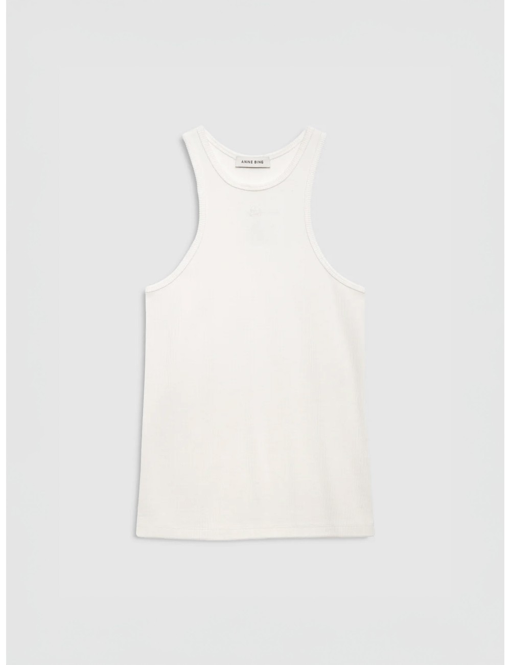 El top Cole de Anine Bing en color ivory aporta una línea depurada y ceñida, con escote redondo y silueta sin mangas de inspiración tank. Su textura acanalada y el pequeño monograma tonal en el pecho refuerzan una estética limpia, pensada para funcionar como base esencial con denim, sastrería relajada o capas ligeras.
