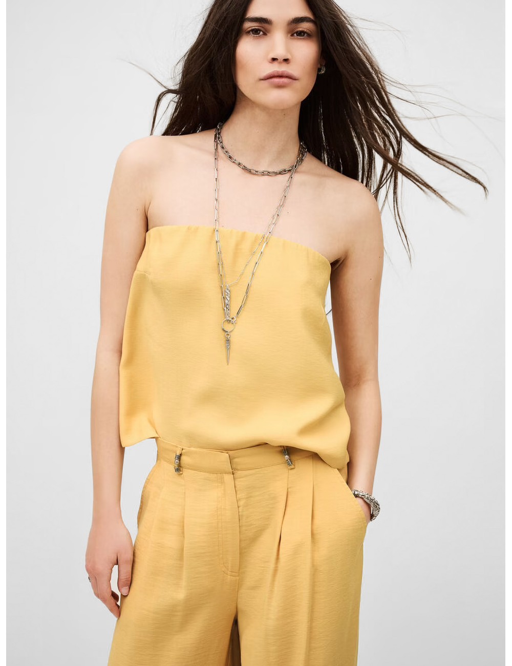 El color Paille introduce un amarillo suave y luminoso, con un matiz cálido que refuerza el carácter estival de la pieza. Sobre esa base, el tejido de acabado satinado aporta profundidad visual y una luz contenida, suficiente para elevar el conjunto sin desplazarlo hacia un registro excesivamente formal. El equilibrio entre color y superficie hace que el top resulte delicado, pero también fácil de combinar.