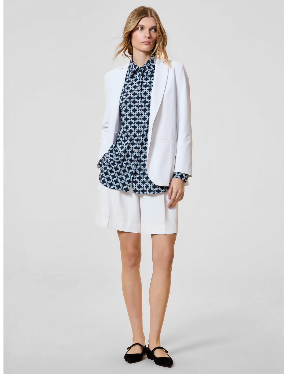 Su formato permite llevarla tanto en conjuntos coordinados como en estilismos más desenfadados. Funciona bien sobre camisas, tops finos o camisetas, y encuentra un buen equilibrio con pantalones cortos, pantalones rectos o faldas de líneas limpias. La abertura central en la espalda favorece el movimiento y aligera visualmente la caída de la prenda.