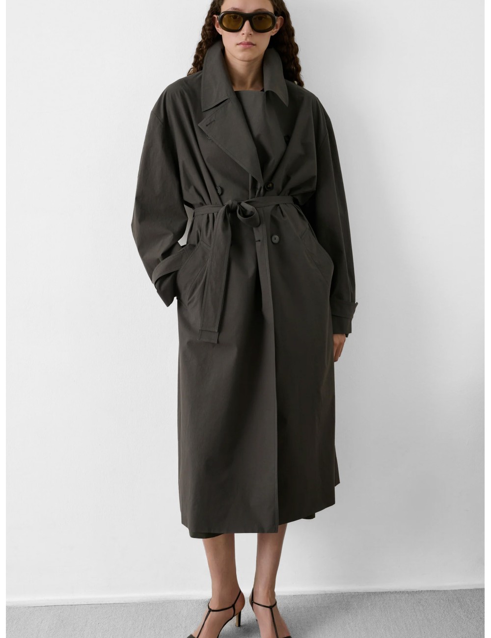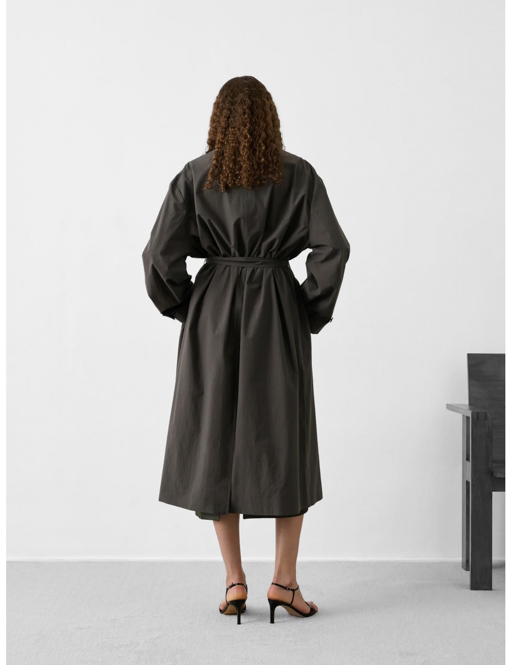 El Soeur Helio se define por una construcción amplia y una caída limpia que aportan presencia sin rigidez. El tono anthracite foncé acentúa su carácter sobrio y profundo, mientras que el cierre cruzado y la solapa generosa construyen una silueta envolvente, de inspiración clásica reinterpretada desde una óptica contemporánea. Es una pieza que destaca por su equilibrio entre estructura y fluidez.