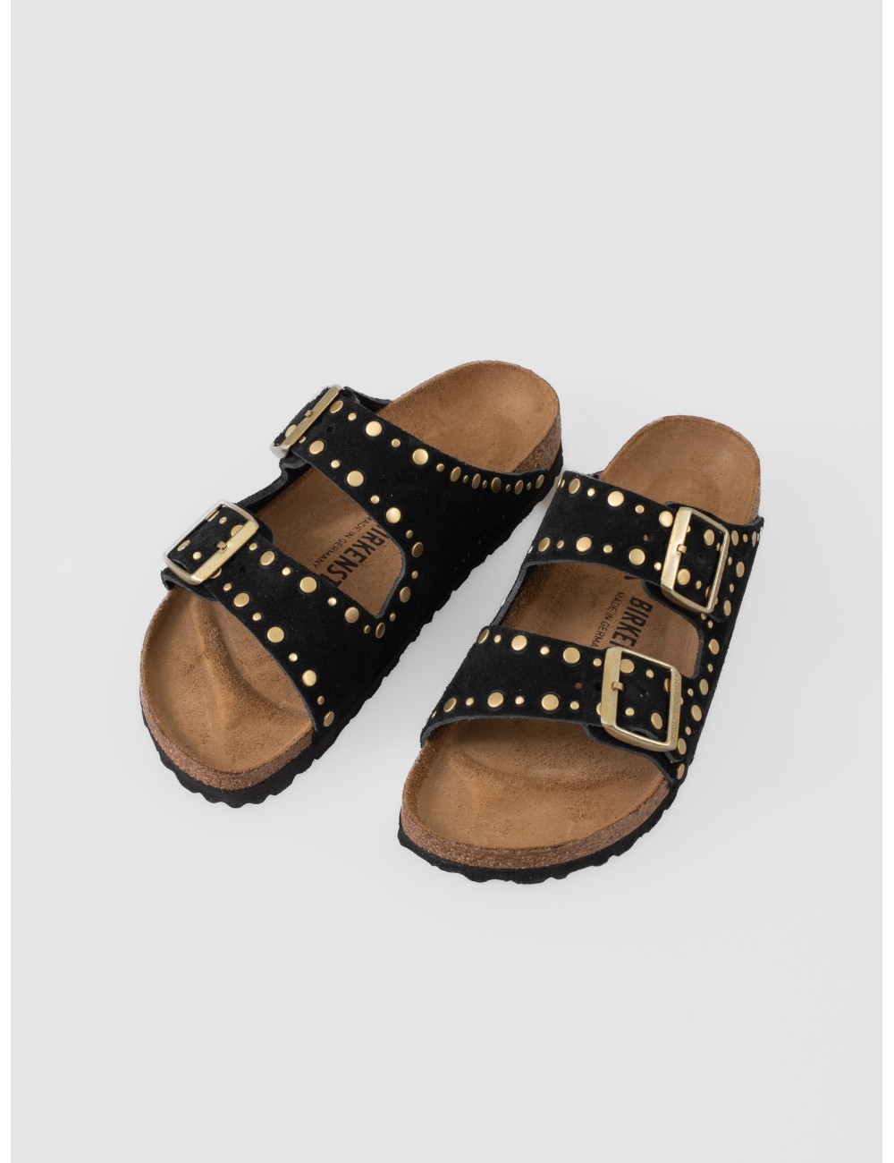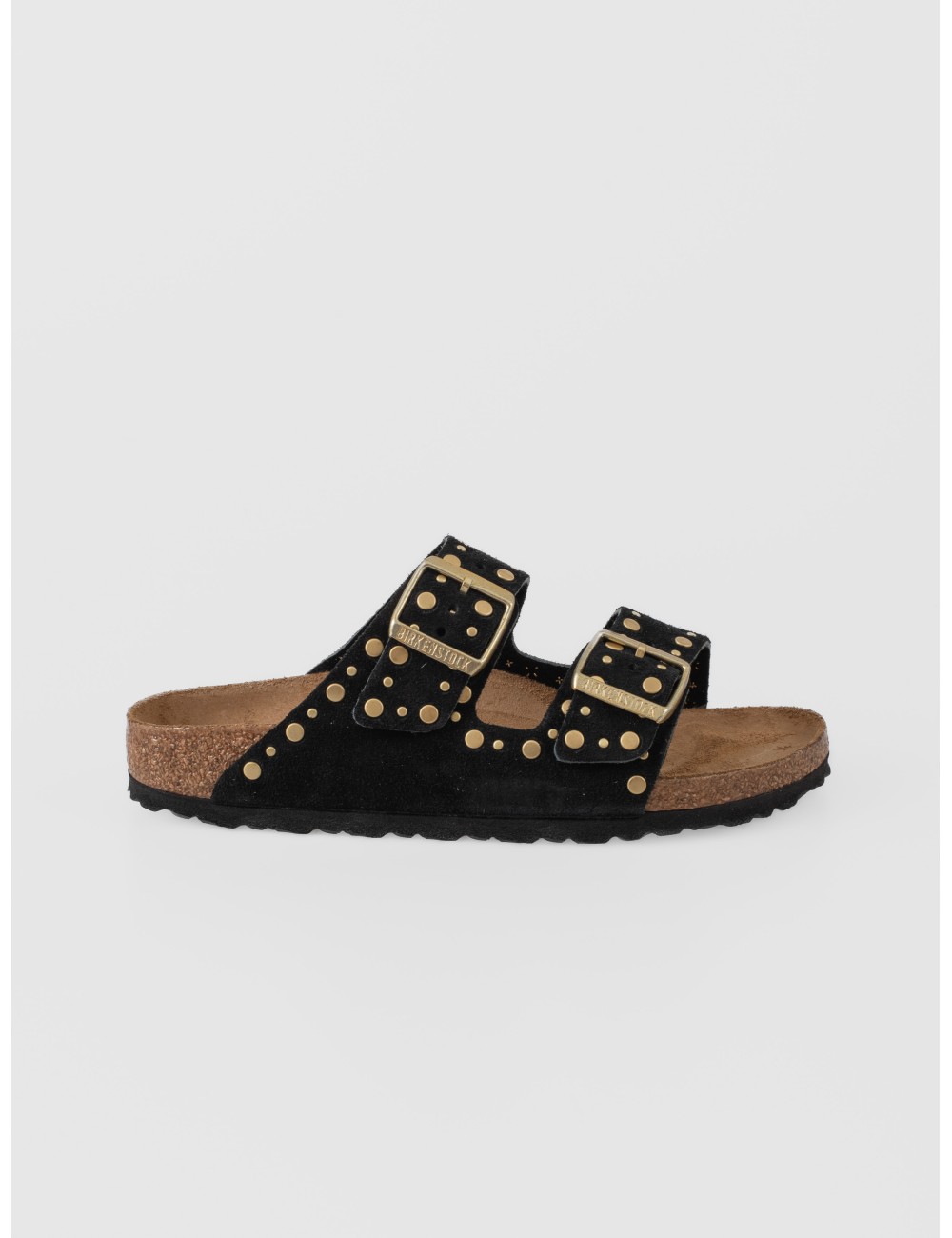 La Birkenstock Arizona Rivet Border es una sandalia de dos tiras en color negro que conserva la lectura esencial del modelo Arizona y añade un acabado de remaches metálicos repartidos por el contorno y las hebillas. El contraste entre el ante negro, la plantilla en tono natural y la base de corcho refuerza su perfil reconocible sin alejarla de la línea clásica de la marca.