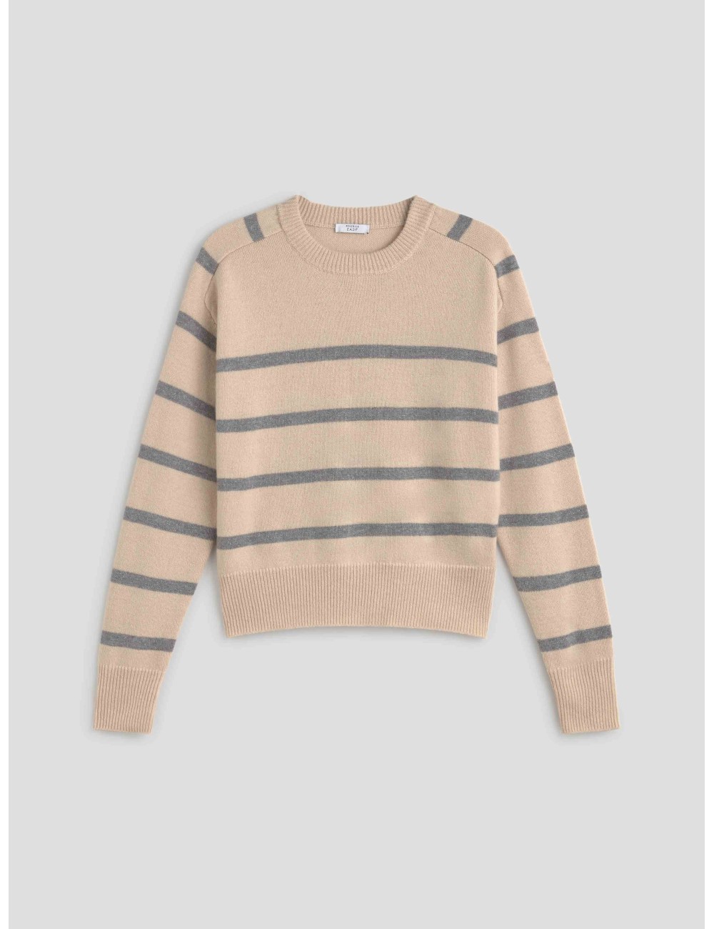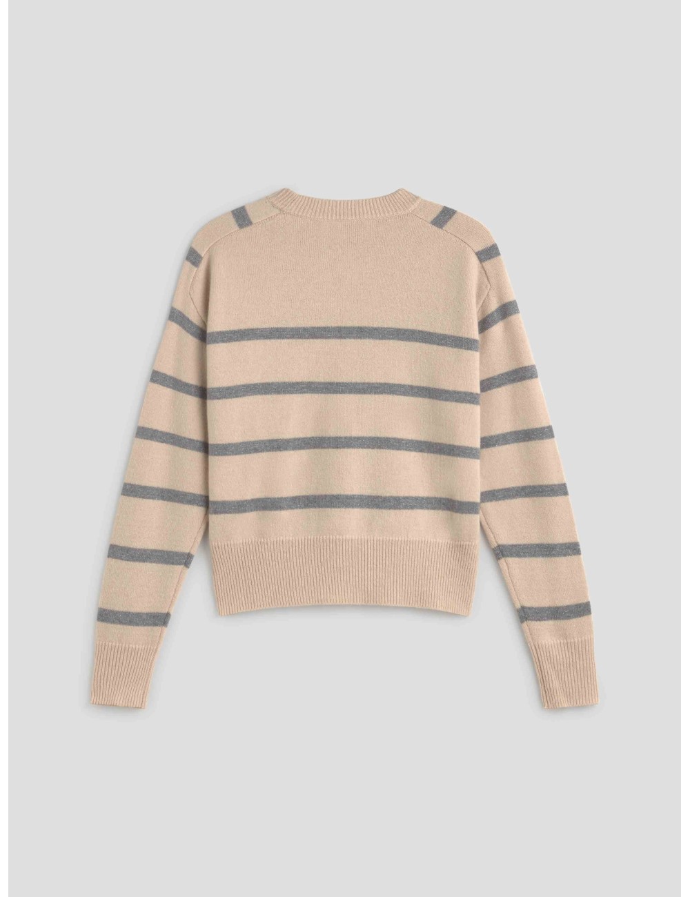 Este jersey de lana de la firma PESERICO EASY presenta un corte recto, cuello redondo y detalles en canalé. Su diseño presenta un contraste de rayas gris con un toque brillante sobre beige. Una pieza versátil y perfecta para cualquier ocasión casual.