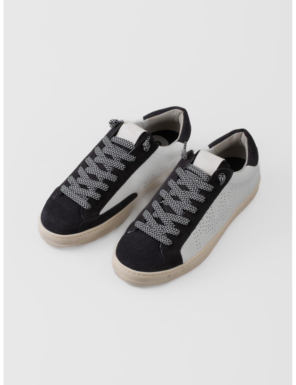 Sneaker P448 John 2 para hombre en piel blanca con puntera y cordonera en contraste antracita. La silueta de perfil bajo combina el lateral perforado característico del modelo con cordones bicolor y una base de goma en tono crema, equilibrando limpieza visual y acento gráfico.