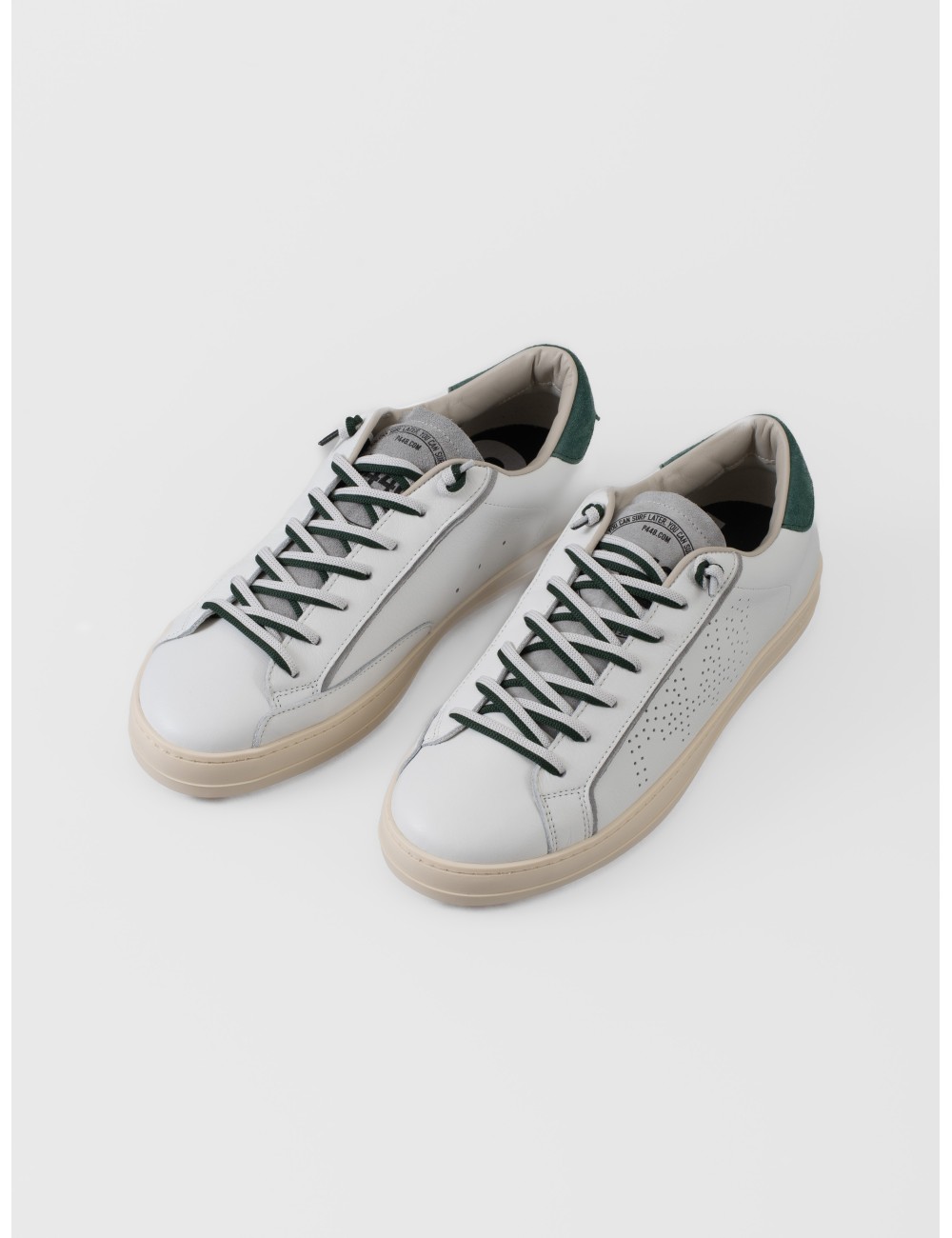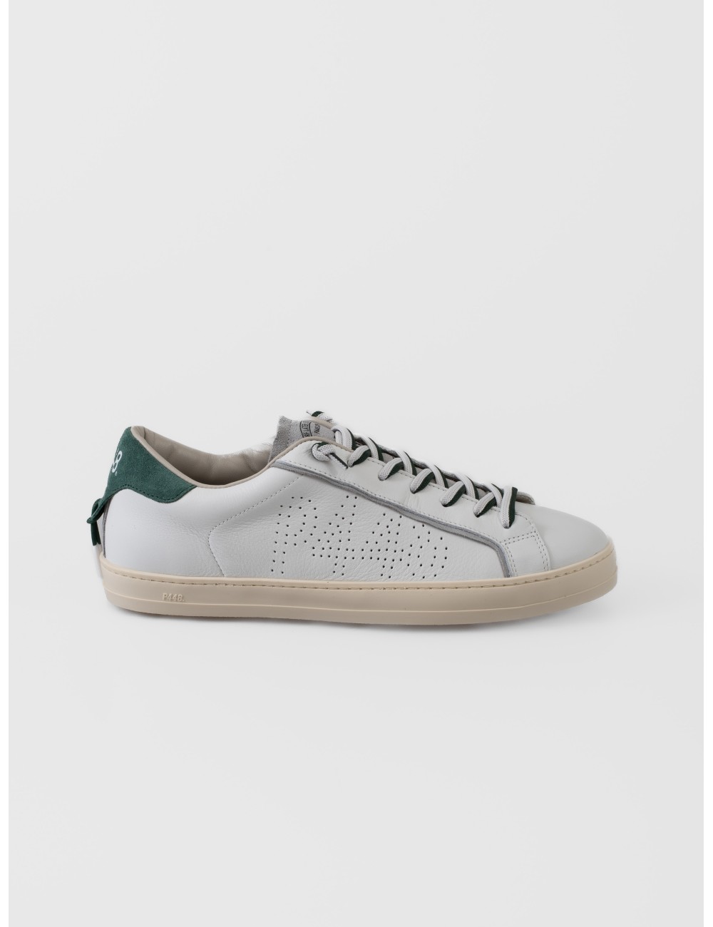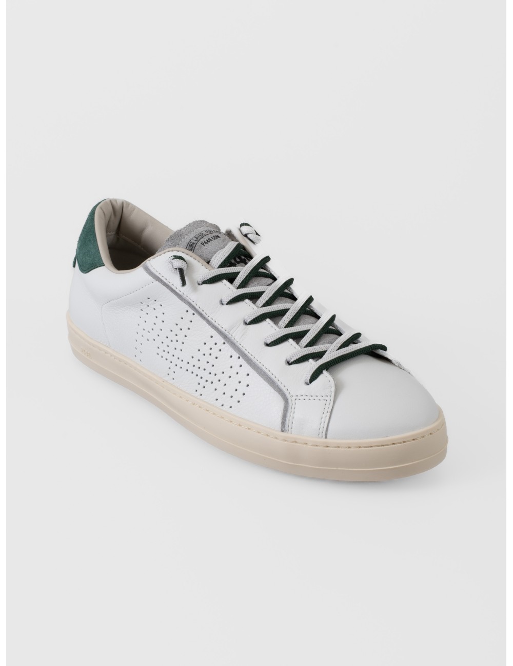 Sneaker P448 John White Forrest para hombre en piel blanca con ribetes grises y talón en ante verde. La silueta de perfil bajo combina el lateral perforado característico del modelo con cordones bicolor y una suela de goma en tono crema.